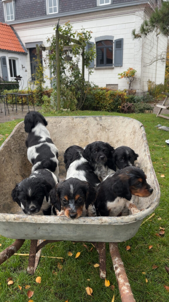 Nous sommes heureux de vous annoncer la naissance d’une magnifique portée d’Épagneuls Bretons en septembre 2025. Cette portée compte 8 chiots, dont 5 femelles et 3 mâles, aux caractères déjà bien prometteurs. Les chiots présentent de jolies robes variées : certains sont tout noirs, d’autres noir et blanc, et d’autres encore marron et noir, offrant un éventail de couleurs harmonieux et typique de la race. Ces petits compagnons sont élevés avec soin et dans un environnement familial, prêts à apporter joie, énergie et affection à leurs futures familles.